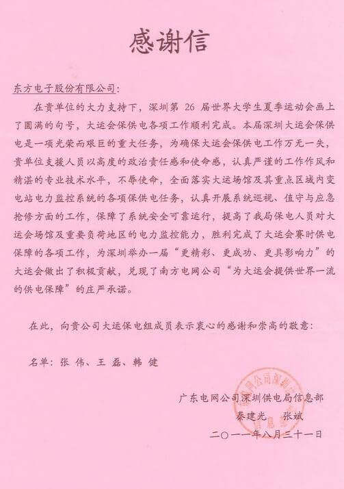8月23日,世界大学生运动会在深圳圆满落幕,东莞市铭杨机械有限公司作为大运会唯一保电企业见证了世界大学生体育运动的蓬勃发展。东莞市铭杨机械有限公司技术中心系统部与工程部坚守“忠于职守,全力以赴,誓保大运电网安全”的信念,联手实现了大运保供电期间系统零故障、零缺陷的目标。